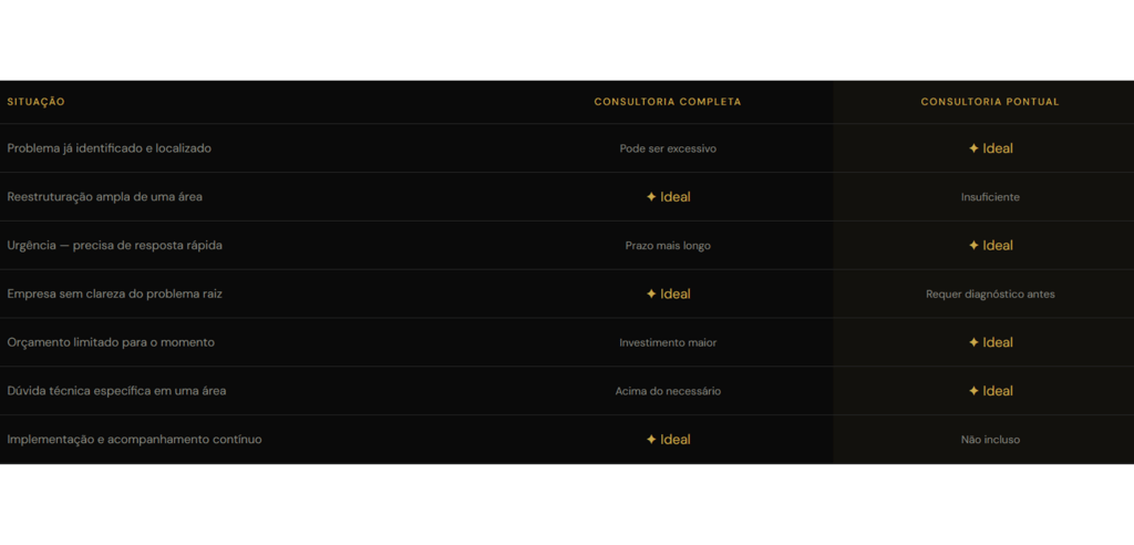 Você tem um problema específico e precisa de uma resposta especializada — sem contratos longos, sem projetos extensos. A Consultoria Pontual da Fullscopelux atua cirurgicamente na sua dor, entregando solução imediata com o mesmo rigor técnico dos nossos projetos completos.